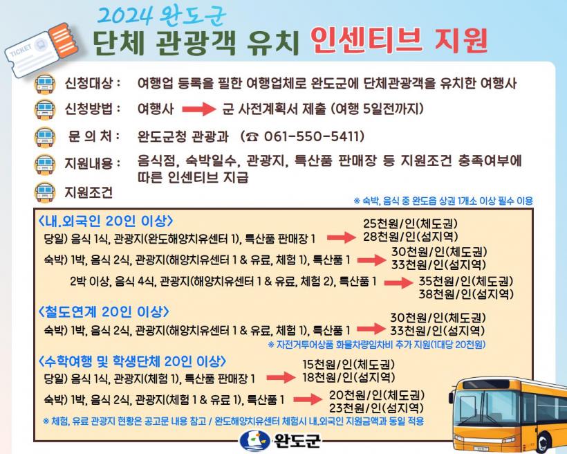 Áö¿ø ³»¿ëÀº ¿Ïµµ±º ´ëÇ¥ À£´Ï½º °ü±¤ÁöÀÎ ¿ÏµµÇؾçÄ¡À¯¼¾Å͸¦ Çʼö·Î ¹æ¹®Çϰí À½½ÄÁ¡°ú Ư»êǰ ÆÇ¸ÅÀåÀ» ÀÌ¿ëÇϸé 1Àδç 2¸¸ 5õ ¿ø, 1¹ÚÀ» Çϸé 3¸¸ ¿ø, 2¹ÚÀ» Çϸé 3¸¸ 5õ ¿øÀ» Áö¿øÇÑ´Ù.