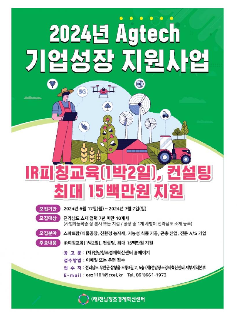 [°ø°£´º½º = ±è¼ö±Ù±âÀÚ] Àü¶ó³²µµ´Â 7¿ù 7ÀϱîÁö ¾Ö±×Å×Å©(AgTech)ºÐ¾ßÀÇ ±â¾÷ ¼ºÀå°ú ÅõÀÚÀ¯Ä¡ ¿ª·® °È¸¦ À§ÇÑ Áö¿ø»ç¾÷ Âü¿© ±â¾÷À» ¸ðÁýÇÑ´Ù.