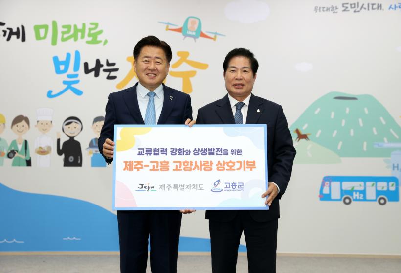 ÀÌ¿¡ ¾Õ¼, Áö³ÇØ 1¿ù °ø¿µ¹Î ±º¼ö°¡ Á¦ÁÖ-°íÈï °£ »ó»ý¹ßÀü°ú ±³·ù Çù·Â ÇÁ·ÎÁ§Æ® ÃßÁøÀ» À§ÇÑ Á¦Áֹ湮¿¡¼ °íÇâ»ç¶û±âºÎ±ÝÀ» ±âŹÇÑ µ¥ À̾î 6¿ù ¿À¿µÈÆ µµÁö»çÀÇ °íÈﱺ ÃÊû Ư°°ú °íÇâ»ç¶û±âºÎ±Ý ±âŹÀÌ ÀÌ·ç¾îÁø ¹Ù ÀÖ´Ù. À̳¯¿¡µµ °íÈﱺ°ú Á¦ÁÖµµ´Â °¢°¢ 2õ¸¸ ¿øÀÇ °íÇâ»ç¶û±âºÎ±ÝÀ» Àü´ÞÇϸç Áö¼ÓÀûÀÎ ±³·ù¿Í »ó»ý¹ßÀü Çù·Â¿¡ ¾ÕÀå¼±â·Î Çß´Ù.