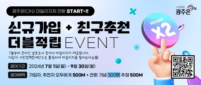 ±¤Áֽô ±¤ÁÖ¿Â(ON) ¸¶Àϸ®ÁöÁ¦ µµÀÔÀ» ±â³äÇØ ¡®½Å±Ô °¡ÀÔ¡¯¡¤¡®Ä£±¸ Ãßõ¡¯ ´õºíÀû¸³ À̺¥Æ®¸¦ 7¿ùºÎÅÍ 9¿ù±îÁö ÁøÇàÇÑ´Ù. ±âÁ¸ ½Ã¹Î Á¤Ã¥Âü¿©´ÜÀ̳ª ½Å±Ô °¡ÀÔÀÚ°¡ °¡Á·, ÁöÀÎ µîÀ» »õ·Î ÃßõÇϸé 500¸¶Àϸ®Áö¸¦ Á¦°øÇϸç, ¸Å¿ù 100¸íÀ» ÃßÃ·ÇØ 500¸¶Àϸ®Áö¸¦ Ãß°¡·Î Àû¸³ÇØ ÁØ´Ù.