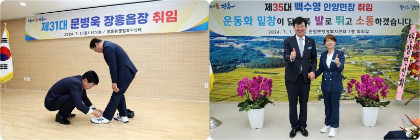 ½ÅÀÓ À¾¡¤¸éÀå ÃëÀÓ½ÄÀº 1ÀÏ ¹®º´¿í ÀåÈïÀ¾Àå, ¹é¼ö¿µ ¾È¾ç¸éÀå¿¡ À̾î, 2ÀÏ ÀåÂù¼® ȸÁø¸éÀå ¼øÀ¸·Î ¿·È´Ù. ÃëÀÓ½Ä Âü¼®ÇÑ ±è¼º ±º¼ö´Â ¿îµ¿È¸¦ ¼±¹°·Î Àü´ÞÇϰí, Á÷Á¢ ½Å¹ß²öÀ» ¹¾îÁÖ¸ç ¹ß·Î ¶Ù´Â ÇöÀåÇàÁ¤À» ÁÖ¹®Çß´Ù.