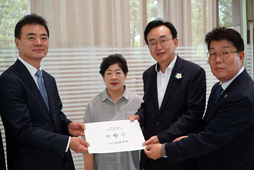 [°ø°£´º½º = Àå¿ÁÁø±âÀÚ] À±º´Å Àü³² ³ªÁÖ½ÃÀåÀÌ LGÈÇгªÁÖ°øÀå ½Å»ç¾÷ À¯Ä¡¸¦ ÅëÇÑ »ó»ý¹ßÀüÀ» Á¦¾ÈÇÏ´Â ³»¿ëÀÇ ¼Çѹ®À» LG±×·ì Ãø¿¡ Àü´ÞÇØ À̸ñÀÌ ÁýÁߵǰí ÀÖ´Ù.