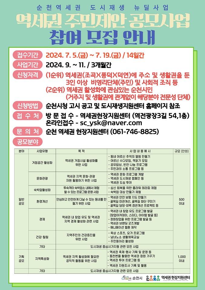 [°ø°£´º½º = ±è¿ëÁø±âÀÚ] ¼øÃµ½Ã(½ÃÀå ³ë°ü±Ô)´Â ¿ª¼¼±Ç ÀÏ¿ø µµ½ÃÀç»ý »ç¾÷±¸¿ª(Á¶°î․dz´ö․´ö¿¬)À» ´ë»óÀ¸·Î 2024³â ÁÖ¹ÎÁ¦¾È °ø¸ð»ç¾÷ ½ÅûÀÚ¸¦ ¿À´Â 19ÀϱîÁö ¸ðÁýÇÑ´Ù.