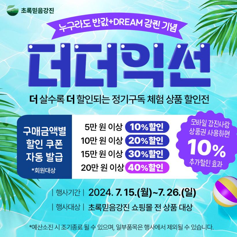 ƯÈ÷, ¡®´õ´õÀͼ±¡¯À̶ó´Â Å׸¶·Î ´õ ¸¹ÀÌ »ì¼ö·Ï ´õ Å« ÇÒÀÎÀ» ¹ÞÀ» ¼ö ÀÖ´Â ±âȸ¸¦ Á¦°øÇÑ´Ù. ÃʷϹÏÀ½°Áø ȸ¿øÀ̶ó¸é Á¤±â±¸µ¶ üÇè¿ë ÄíÆùÀÌ Áö±ÞµÇ¸ç, 5¸¸¿ø ÀÌ»ó ±¸¸Å ½Ã 10%, 10¸¸¿ø ÀÌ»ó ±¸¸Å ½Ã 20%, 15¸¸¿ø ÀÌ»ó ±¸¸Å ½Ã 30%, 20¸¸¿ø ÀÌ»ó ±¸¸Å ½Ã 40% ÇÒÀÎÀÌ Àû¿ëµÈ´Ù. ¿©±â¿¡ ¸ð¹ÙÀÏ °Áø»ç¶û »óǰ±ÇÀ» ±¸ÀÔÇϸé Ãß°¡·Î 10% ÇÒÀÎÀÌ Àû¿ëµÅ ÃÖ´ë 50% ÇÒÀÎ È¿°ú¸¦ ´©¸± ¼ö ÀÖ´Ù.