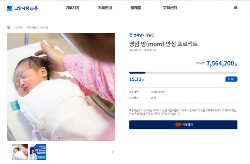 Áö³´Þ 4ÀϺÎÅÍ ±âºÎ±ÝÀ» ¹Þ´Â ¡®°íÇâ»ç¶ûeÀ½¡¯ »çÀÌÆ®¿¡¼ ¡®¿µ¾Ï ¸¾(mom) ¾È½É ÇÁ·ÎÁ§Æ®¡¯ ÁöÁ¤±âºÎ¸¦ ½ÃÀÛÇØ 76°Ç¿¡ 750¸¸¿ø°¡·® ¸ð±ÝÇß´Ù.
