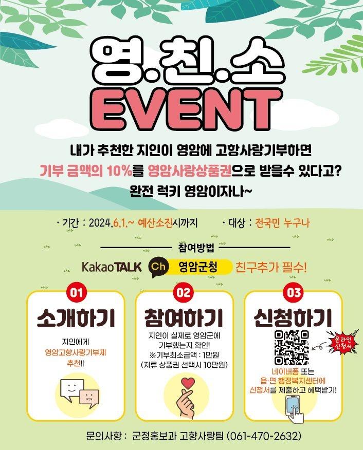 Áö³´ÞºÎÅÍ´Â ³»°¡ ÃßõÇÑ ÁöÀÎÀÌ ¿µ¾Ï¿¡ °íÇâ»ç¶û±âºÎÇϸé ÃßõÀÚ¿¡°Ô ±âºÎ±Ý¾×ÀÇ 10%¸¦ ¿µ¾Ï»ç¶û»óǰ±ÇÀ¸·Î Áö±ÞÇÏ´Â ¡®¿µ¡¤Ä£¡¤¼Ò¡¯ À̺¥Æ®µµ ÁøÇàÇϰí ÀÖ´Ù.