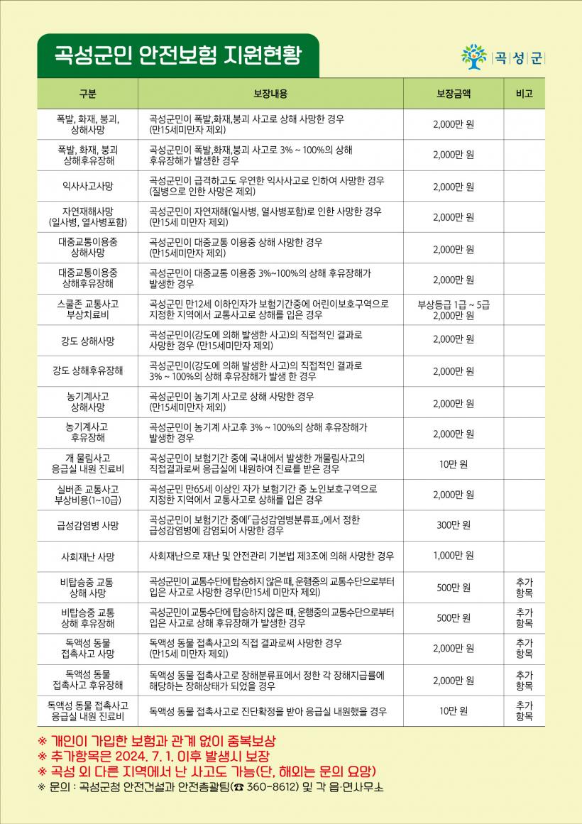 °î¼º±º¿¡ Áֹεî·ÏÀ» µÐ ¿Ü±¹ÀÎÀ» Æ÷ÇÔÇØ ¸ðµç ±º¹ÎÀÌ¸é ´©±¸³ª °¡ÀÔ ÀýÂ÷ ¾øÀÌ 20°³ Ç׸ñ¿¡ ´ëÇØ ÃÖ´ë 2õ¸¸ ¿øÀ» º¸ÀåÇϰí ÀÖ´Ù. º¸Çè·á´Â °î¼º±º¿¡¼ Àü¾× ºÎ´ãÇØ °³º° º¸Çè·á´Â ¾øÀ¸¸ç, °³Àκ°·Î °¡ÀÔÇÑ º¸Çè°ú °ü°è¾øÀÌ Áߺ¹ º¸»óÀÌ °¡´ÉÇϰí, °î¼ºÁö¿ª ¿Ü ´Ù¸¥ Áö¿ª¿¡¼ ³ »ç°íµµ º¸»óÀ» ¹ÞÀ» ¼ö ÀÖ´Ù.
