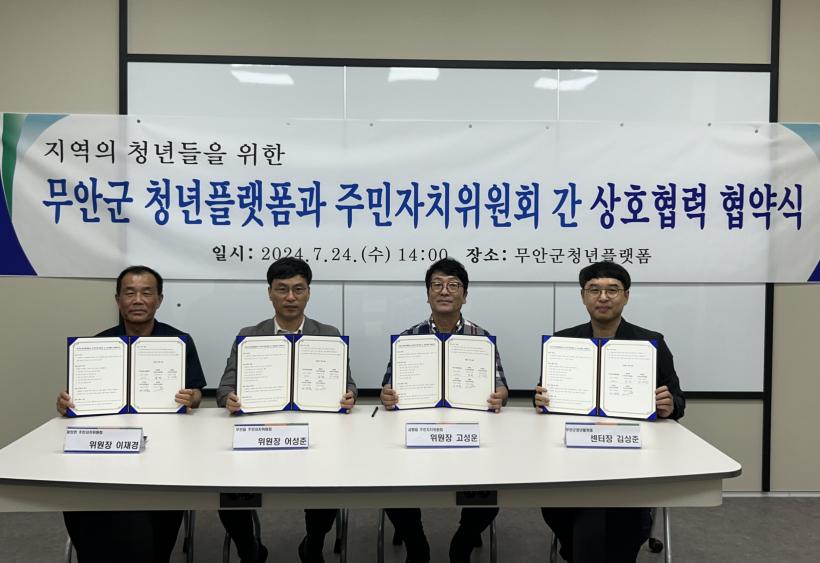 Áö³ 7¿ù 24ÀÏ ¿ÀÈÄ 2½Ã, ¹«¾È±ºÃ»³âÇ÷§Æû¿¡¼ ¿¸° ¹«¾È±ºÃ»³âÇ÷§Æû°ú ¹«¾È±º 4°³ ÁÖ¹ÎÀÚÄ¡À§¿øÈ¸ °£ »óÈ£Çù·Â MOU ü°á½Ä¿¡´Â »ïÇâÀ¾ ÁÖ¹ÎÀÚÄ¡À§¿øÈ¸ °í¼º¿î À§¿øÀå, ¹«¾ÈÀ¾ ÁÖ¹ÎÀÚÄ¡À§¿øÈ¸ ¾î¼ºÁØ À§¿øÀå, ¸ùź¸é ÁÖ¹ÎÀÚÄ¡À§¿øÈ¸ ÀÌÀç°æ À§¿øÀå, ±×¸®°í ¹«¾È±º û³âÇ÷§Æû ±è»óÁØ ¼¾ÅÍÀå °ú °ü°èÀÚ 10¿©¸íÀÌ Âü¼®ÇØ ¶æ±íÀº ÀÚ¸®¸¦ °¡Á³´Ù.