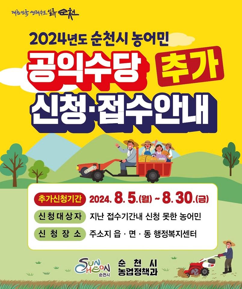 [°ø°£´º½º = ±è¿ëÁø±âÀÚ] ¼øÃµ½Ã(½ÃÀå ³ë°ü±Ô)´Â ¿À´Â 5ÀϺÎÅÍ 30ÀϱîÁö ³ó¾î¹Î °øÀͼö´ç ¼ö±Þ ÀÚ°Ý¿ä°ÇÀ» °®Ãá ³ó¾î¹ÎÀ» ´ë»óÀ¸·Î Ãß°¡½ÅûÀ» Á¢¼öÇÑ´Ù°í ¹àÇû´Ù.