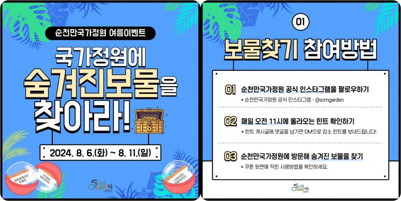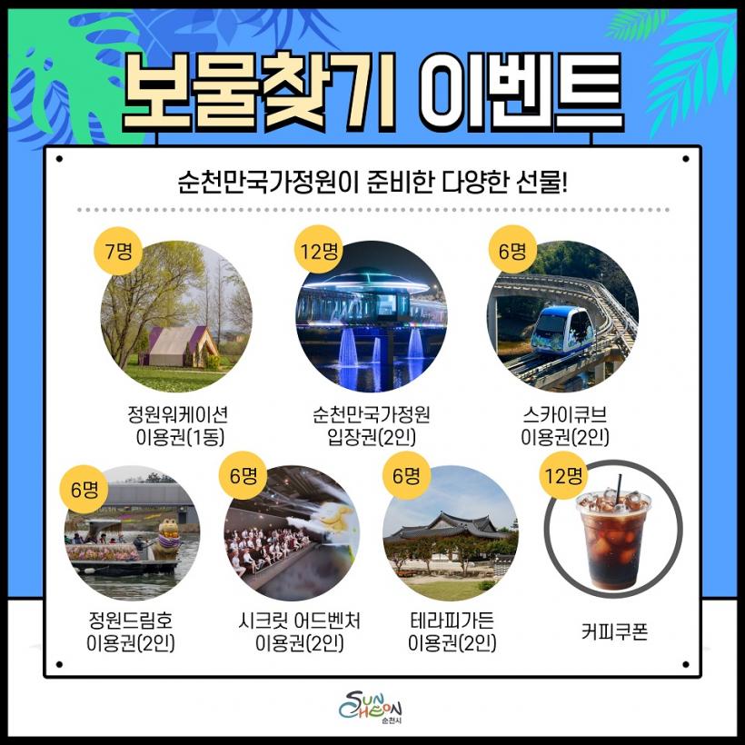 [°ø°£´º½º = ±è¿ëÁø±âÀÚ] ¼øÃµ¸¸±¹°¡Á¤¿ø¿¡¼ ÇÑ¿©¸§ ÈÞ°¡½ÃÁðÀ» ¸Â¾Æ ¿À´Â 6ÀϺÎÅÍ 12ÀϱîÁö 6Àϰ£ Èï¹ÌÁøÁøÇÑ º¸¹°Ã£±â À̺¥Æ®¸¦ °³ÃÖÇÑ´Ù.