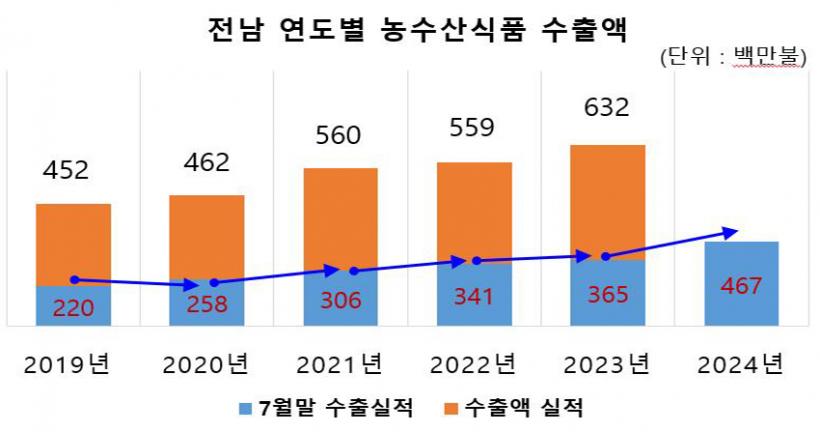 [°ø°£´º½º = ±è¼ö±Ù±âÀÚ] Àü¶ó³²µµ´Â ±è ¼öÃâÀÌ Å©°Ô ´Ã¸é¼ ¿Ã µé¾î 7¿ù ¸» ÇöÀç±îÁö Àü³² ³ó¼ö»ê½Äǰ ¼öÃâ¾×ÀÌ 4¾ï 6õ700¸¸ ´Þ·¯¸¦ ±â·ÏÇß´Ù°í ¹àÇû´Ù. ÀÌ´Â Áö³ÇØ °°Àº ±â°£º¸´Ù 27.9% ´Ã¾î³ °ÍÀ¸·Î ¿ª´ë ÃÖ´ë ±Ô¸ð´Ù.