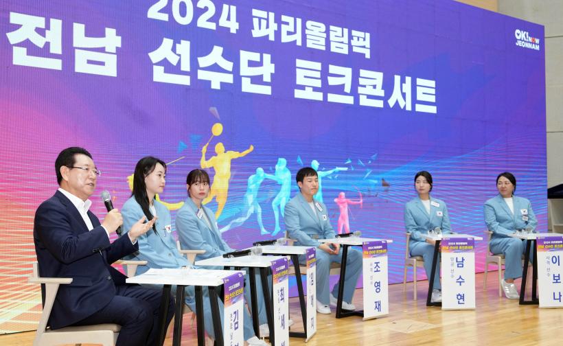 [°ø°£´º½º = ±è¼ö±Ù±âÀÚ] Àü¶ó³²µµ´Â 26ÀÏ µµÃ» ¿ÕÀνǿ¡¼ 2024 ÆÄ¸®¿Ã¸²ÇÈ¿¡ ÃâÀüÇØ ´ëÇѹα¹°ú Àü³²À» ºû³½ ¼±¼öµéÀ» ȯ¿µÇϰí, Áغñ °úÁ¤ µî ¼±¼öµéÀÇ »ý»ýÇÑ °æÇè´ãÀ» µµ¹Î°ú °øÀ¯ÇÏ´Â ÅäÅ©ÄܼƮ¸¦ ÁøÇàÇß´Ù.