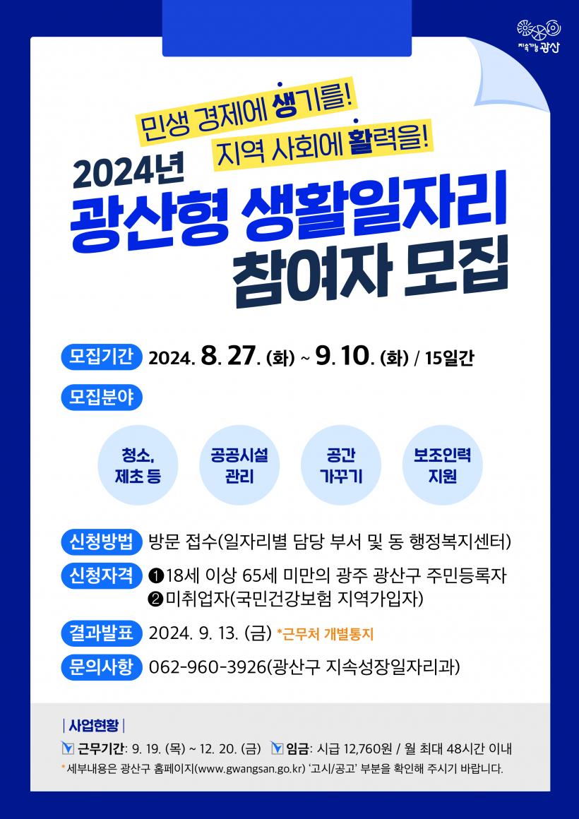 [°ø°£´º½º = ±è´ë¿µ±âÀÚ] ±¤ÁÖ ±¤»ê±¸(±¸Ã»Àå ¹Úº´±Ô)°¡ 27ÀϺÎÅÍ ¿À´Â 9¿ù 10ÀϱîÁö °æ·Â ´ÜÀý µî ¹ÌÃë¾÷ÀÚ¸¦ ´ë»óÀ¸·Î ´ë±Ô¸ð »ýȰ ÀÏÀÚ¸® »ç¾÷ Âü¿©ÀÚ¸¦ ¸ðÁýÇÑ´Ù.