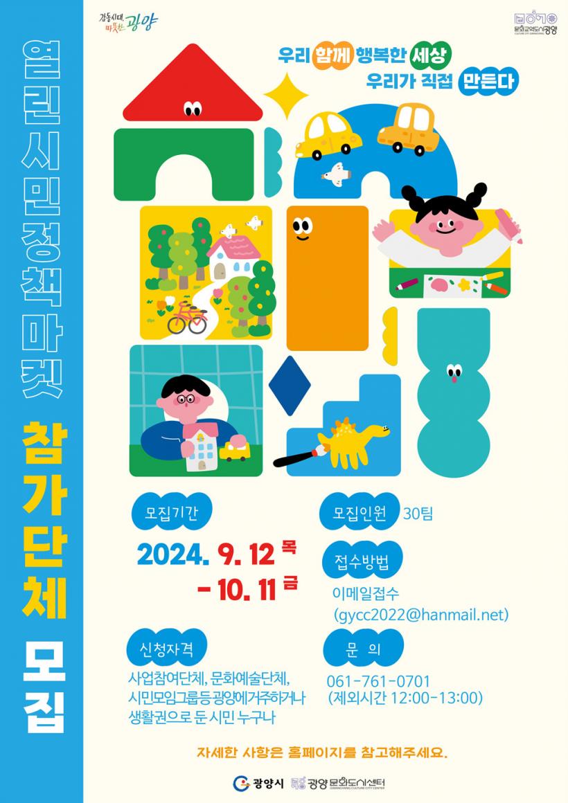 ±¤¾ç½Ã´Â ¹®È¿¹¼ú´Üü, µµ½Ã°øµ¿Ã¼±×·ì, ½Ã¹Îµ¿È£È¸, ¼Ò¸ðÀÓ µî 5¸í ÀÌ»óÀ¸·Î ±¸¼ºÇÑ ÆÀÀ» ÃÑ 30ÆÀÀ» ¸ðÁýÇÑ´Ù. ±¤¾ç¿¡ °ÅÁÖÇϰųª »ýȰ±ÇÀ¸·Î µÐ ½Ã¹ÎÀº ´©±¸µç ¿¬·É Á¦ÇÑ ¾øÀÌ Âü¿©ÇÒ ¼ö ÀÖ´Ù. ¿¸°½Ã¹ÎÁ¤Ã¥¸¶ÄÏ Âü¿©´Üü ¸ðÁý°ø°í ¹× Á¢¼ö ±â°£Àº 9¿ù 12ÀϺÎÅÍ 10¿ù 11ÀϱîÁöÀÌ¸ç ¼±Á¤ °á°ú´Â 10¿ù 15ÀÏ ¹ßÇ¥ÇÒ ¿¹Á¤ÀÌ´Ù.