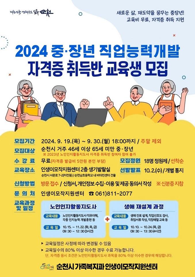 [°ø°£´º½º = ±è¿ëÁø±âÀÚ] ¼øÃµ½Ã(½ÃÀå ³ë°ü±Ô) ÀλýÀ̸ðÀÛÁö¿ø¼¾ÅÍ´Â Áß‧Àå³â Á÷¾÷´É·Â°³¹ßÀÇ ÀÏȯÀ¸·Î ³ëÀÎÀÎÁöȰµ¿Áöµµ»ç ÀÚ°ÝÁõ¹ÝÀ» °³¼³Çϰí 30ÀϱîÁö ¼ö°»ýÀ» ¸ðÁýÇÑ´Ù°í ¹àÇû´Ù.