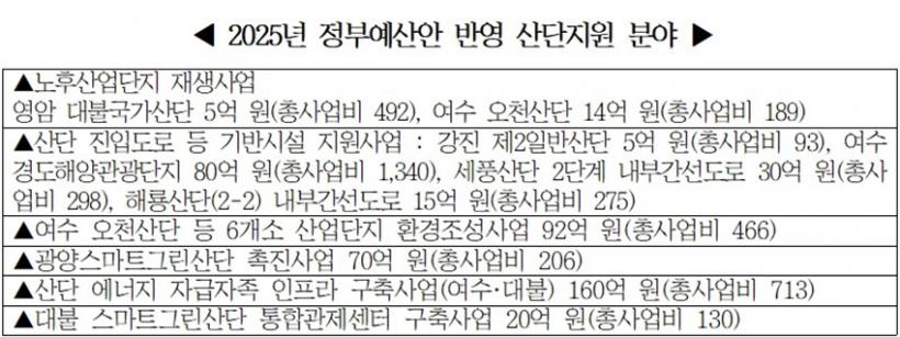[°ø°£´º½º = ±è¼ö±Ù±âÀÚ] Àü¶ó³²µµ´Â 2025³â Á¤ºÎ¿¹»ê¾È¿¡ ³ëÈÄ »ê´Ü ±â¹Ý½Ã¼³ Á¤ºñ, ÁøÀÔµµ·Î °³¼³, ±Ù·Îȯ°æ °³¼± µî »ê´Ü Áö¿ø ºÐ¾ß ÃÑ 6°³ »ç¾÷¿¡ 491¾ï ¿ø(ÃÑ»ç¾÷ºñ 4õ202¾ï ¿ø)ÀÌ ¹Ý¿µµÅ ½Å»ê¾÷ À°¼º±âÁö µµ¾à ¹ßÆÇÀ» ¸¶·ÃÇß´Ù°í ¹àÇû´Ù.
