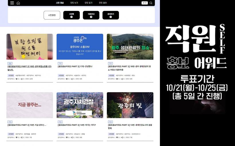 ±¤ÁÖ±¤¿ª½Ã(½ÃÀå °±âÁ¤)´Â 21ÀϺÎÅÍ 25ÀϱîÁö 5Àϰ£ ±¤Áֽà Á¾ÇÕÈ«º¸Ç÷§Æû ¡®¸ðµÎÀDZ¤ÁÖ¡¯¸¦ ÅëÇØ Á÷¿øµéÀÌ ¸¸µç È«º¸ ¼îÃ÷¿µ»óÀ» ¼±º¸ÀδÙ. ³»ºÎ °ø¸ðÀüÀ» ÅëÇØ Á¢¼öµÈ ÃÑ 18°³ÀÇ ÀÛǰÀÌ ¡®¸ðµÎÀDZ¤ÁÖ¡¯ ½Ã¹Î±¤Àå ä³Î¿¡ °ø°³µÈ´Ù.