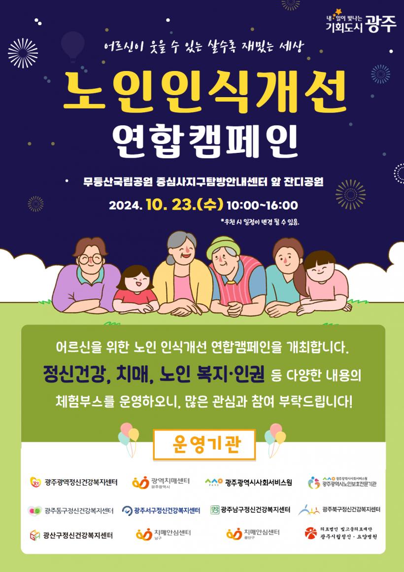 [°ø°£´º½º = ±è¼ö±Ù±âÀÚ] ±¤ÁÖ±¤¿ª½Ã(½ÃÀå °±âÁ¤)´Â ³ëÀÎÀÇ ³¯(10¿ù 2ÀÏ)À» ¸Â¾Æ ¿À´Â 23ÀÏ ¹«µî»ê±¹¸³°ø¿ø ¹®ºóÁ¤»ç ¾Õ ÀÜµð°ø¿ø¿¡¼ ¡®³ëÀÎ Á¤½Å°Ç° ¹× º¹Áö ÀÎ½Ä °³¼± ¿¬ÇÕ Ä·ÆäÀΡ¯À» ÁøÇàÇÑ´Ù.