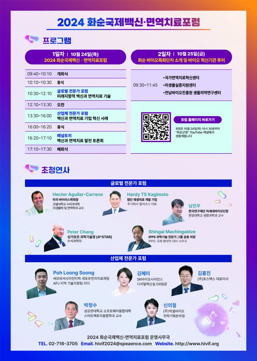 8ȸ°¸¦ ¸Â´Â ȼø±¹Á¦¹é½Å․¸é¿ªÄ¡·áÆ÷·³Àº ´ëÇѹα¹ À¯ÀÏÇÑ ¹é½ÅƯ±¸ÀÌÀÚ, ±¹°¡Ã·´ÜÀü·«»ê¾÷ ¹ÙÀÌ¿À ƯȴÜÁö·Î ¼±Á¤µÈ Àü³² ȼø¿¡¼ °³ÃֵǴ Æ÷·³À¸·Î, ±¹³»¿Ü ¼¼°èÀûÀÎ ¹é½Å Àü¹®°¡¿Í ±â¾÷ÀÎ, ¿¬±¸ÀÚ, Çлý ¹× ÀÏ¹Ý Âü°¡ÀÚ±îÁö ¾à 900¸íÀÌ ÇÑÀÚ¸®¿¡ ¸ðÀÏ ¿¹Á¤ÀÌ´Ù. ÀÚ¼¼ÇÑ ³»¿ëÀº ȨÆäÀÌÁö(https://hivif.org)¿¡¼ È®ÀÎÇÒ ¼ö ÀÖ´Ù.