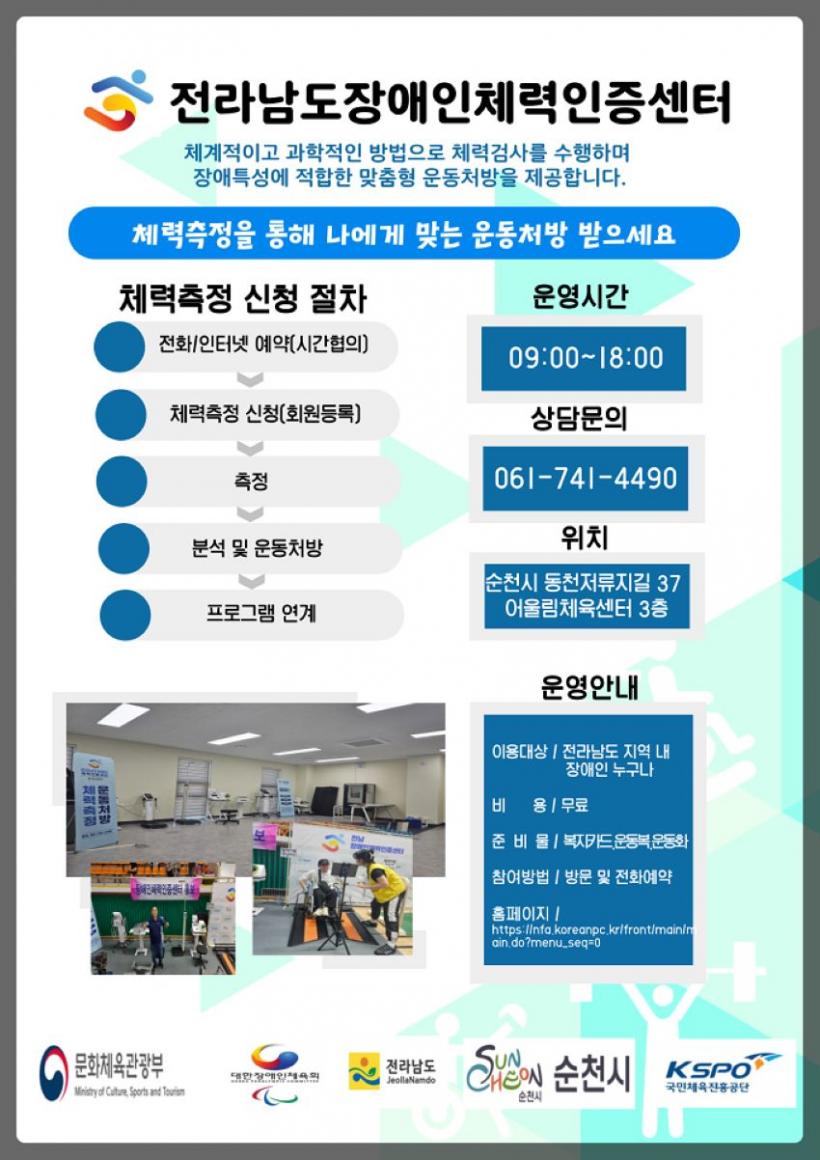 ¼¾ÅÍ´Â Àå¾ÖÀεéÀÇ Ã¼·Â°ü¸®¿Í üÀ°È°µ¿ Âü¿©¸¦ Áö¿øÇϸç, Àå¾ÖÀÎÀ̶ó¸é ´©±¸³ª ¹«·á·Î ÀÌ¿ëÇÒ ¼ö ÀÖ´Ù. ƯÈ÷, °Ç°¿îµ¿°ü¸®»ç¿Í ü·ÂÃøÁ¤»ç°¡ ÷´Ü Àåºñ¸¦ ÅëÇØ ô¼ö¡¤½Ã°¢¡¤Ã»°¢¡¤ÁöÀûÀå¾Ö µî Àå¾ÖÀ¯Çüº° °úÇÐÀû ü·Â °Ë»ç¸¦ ¼öÇàÇÏ°í °³Àο¡°Ô ÀûÇÕÇÑ ¿îµ¿¹æ¹ýÀ» Á¦°øÇÑ´Ù.