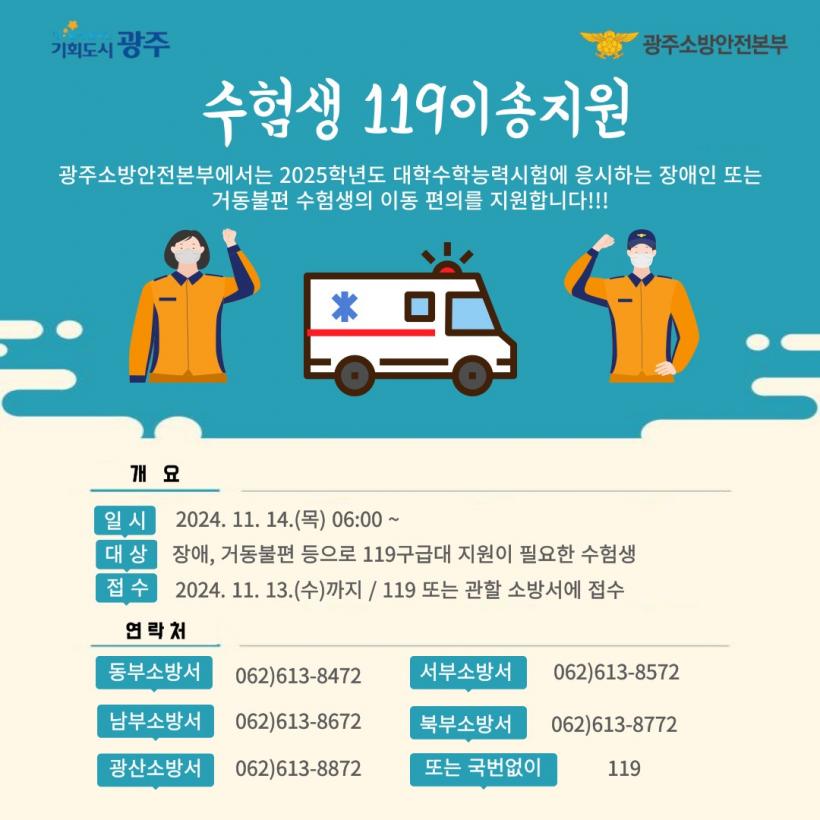 [°ø°£´º½º = ±è¼ö±Ù±âÀÚ] ±¤ÁÖ±¤¿ª½Ã¼Ò¹æ¾ÈÀüº»ºÎ´Â ¿À´Â 11¿ù14ÀÏ ½ÃÇàÇÏ´Â 2025Çг⵵ ´ëÇмöÇдɷ½ÃÇè¿¡ °Åµ¿ÀÌ ºÒÆíÇÑ ¼öÇè»ýÀÇ ÆíÀǸ¦ À§ÇÑ ¡®119 ÀÌ¼Û ¼ºñ½º¡¯¸¦ Á¦°øÇÑ´Ù.