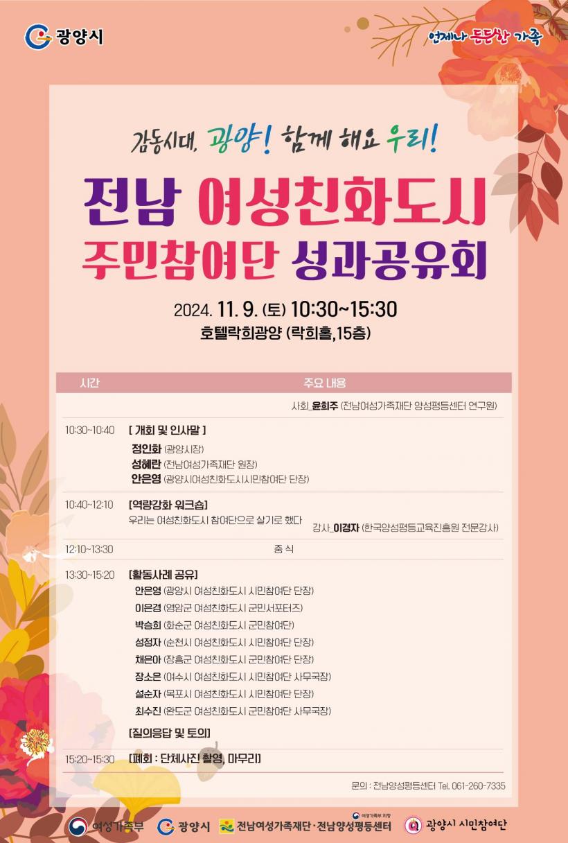 [°ø°£´º½º = ±è¼ö±Ù±âÀÚ] Àü³²¿©¼º°¡Á·Àç´Ü ¾ç¼ºÆòµî¼¾ÅÍ¿Í ±¤¾ç½Ã ¿©¼ºÄ£Èµµ½Ã ½Ã¹ÎÂü¿©´ÜÀº 11¿ù 9ÀÏ(Åä) È£ÅÚ¶ôÈñ±¤¾ç ¶ôÈñȦ¿¡¼ ¡®2024 Àü³² ¿©¼ºÄ£Èµµ½Ã ÁÖ¹ÎÂü¿©´Ü ¼º°ú°øÀ¯È¸¡¯¸¦ °³ÃÖÇÑ´Ù.