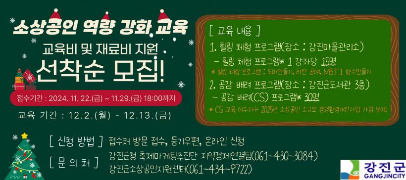 ±³À° ½ÅûÀº ¿À´Â 29ÀϱîÁöÀÌ¸ç ¼±Âø¼øÀ¸·Î Á¢¼öÇÑ´Ù. Âü¿©¸¦ ¿øÇÏ´Â ¼Ò»ó°øÀÎÀº »ç¾÷ÀÚµî·ÏÁõ, ¿¹ºñâ¾÷ÀÚ´Â Áֹεî·Ïµîº» µîÀÇ ¼·ù¸¦ ÁغñÇØ °Áø±º ÃàÁ¦¸¶ÄÉÆÃÃßÁø´Ü(°ÁøÀ¾ ŽÁø·Î 111, 4Ãþ) ¶Ç´Â °Áø±º¼Ò»ó°øÀÎÁö¿ø¼¾ÅÍ(°ÁøÀ¾ ½ÃÀ屿 19, 2Ãþ)¿¡ ¹æ¹® ¶Ç´Â ¿ìÆí, ¿Â¶óÀΠȨÆäÀÌÁö Áß ÆíÇÑ ¹æ¹ýÀ¸·Î ½ÅûÇÏ¸é µÈ´Ù.