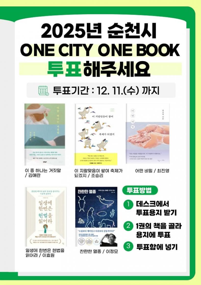 [°ø°£´º½º = ±è¿ëÁø±âÀÚ] ¼øÃµ½Ã(½ÃÀå ³ë°ü±Ô)°¡ ¿À´Â 12¿ù 11ÀϱîÁö 2025³â ÇÑ ÇØ µ¿¾È ¼øÃµ½Ã¹ÎÀÌ ÇÔ²² ÀÐÀ» ¡®2025³â ¼øÃµ½Ã One City One Book¡¯ ¼±Á¤À» À§ÇÑ ½Ã¹Î ÅõÇ¥¸¦ ÁøÇàÇÑ´Ù°í ¹àÇû´Ù.