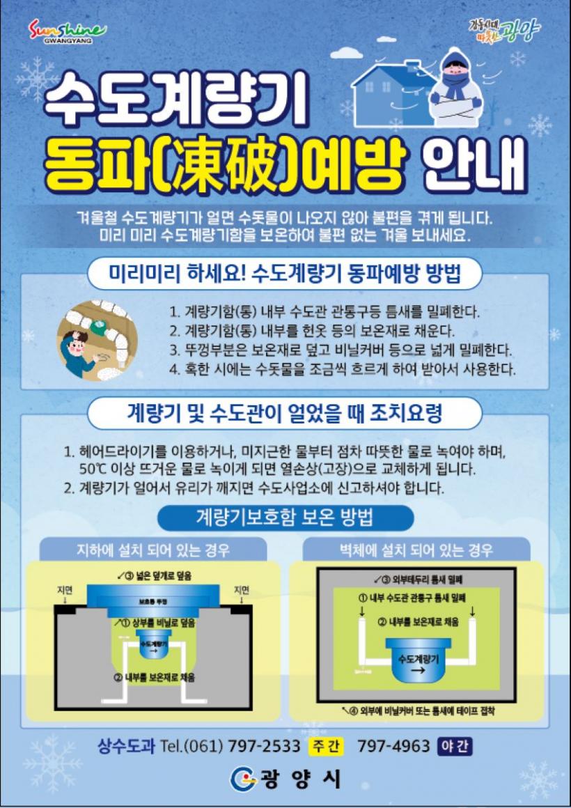 °¡Á¤ ¼öµµ½Ã¼³ÀÌ µ¿ÆÄµÆÀ» ¶§´Â ¿ì¼± °è·®±âÇÔ ³» ¹ëºê¸¦ Àá±×°í Áï½Ã ±¤¾ç½Ã »ó¼öµµ°ú[(ÁÖ°£)¢Ï797-2533, 3585 (¾ß°£)¢Ï797-4963)]·Î ½Å°íÇØ¾ß ÇÑ´Ù. ±¤¾ç½Ã´Â µ¿ÆÄ ½Å°í Á¢¼öⱸ¸¦ ³»³â 3¿ù ÃʱîÁö Æí¼ºÇØ µ¿Àý±â ºñ»ó ±Ù¹«Ã¼°è¸¦ À¯ÁöŰ·Î Çß´Ù.