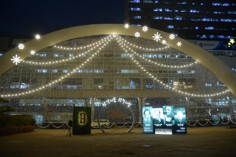 ±¤Áֽô ÇàÁ¤µ¿ ¾Õ ³ôÀÌ 12m, ±æÀÌ 49m Å©±âÀÇ ¾ÆÄ¡Çü ±¸Á¶¹°ÀÎ ¡®ºû°íÀ»¹«Áö°³¡¯¿¡ ¹ß±¤´ÙÀÌ¿Àµå(LED)·Î Á¶¸íÀ» ¼³Ä¡Çϰí, Àü¸éºÎ¿¡´Â ±¤ÁÖ Ãâ½Å ÇѰ ÀÛ°¡ ³ëº§»ó ¼ö»óÀ» ±â³äÇÏ´Â Æ÷ÅäÁ¸À» Á¶¼ºÇß´Ù.