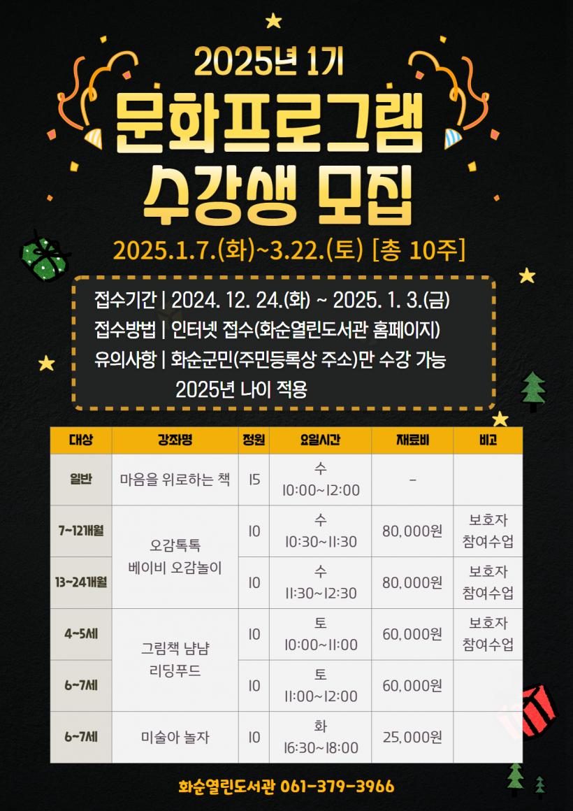 ȼø ¿¸°µµ¼°ü 2025³â 1±â ¹®ÈÇÁ·Î±×·¥Àº ¡ã¸¶À½À» À§·ÎÇϴ å(ÀÏ¹Ý ´ë»ó) ¡ã¿À°¨ÅåÅå ¾Æ±â ¿À°¨ ³îÀÌ(À¯¾Æ ´ë»ó, 2°³ °ÁÂ) ¡ã±×¸²Ã¥ ³È³È ¿ä¸®(À¯¾Æ ´ë»ó, 2°³ °ÁÂ) ¡ã¹Ì¼ú·Î ³îÀÚ(À¯¾Æ ´ë»ó)À̸ç, 6°³ °Á¿¡¼ ÃÑ 65¸íÀ» ¸ðÁýÇÑ´Ù.