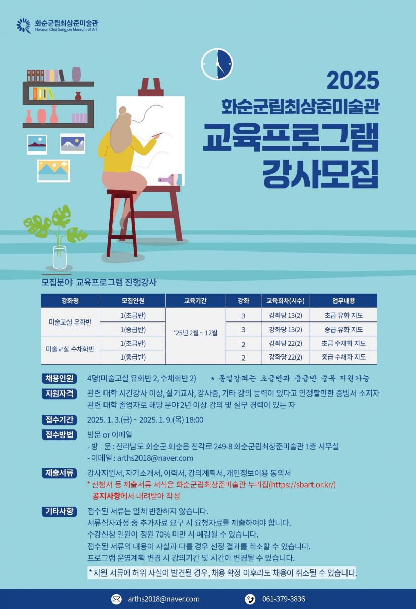 [°ø°£´º½º = ±è¼ö±Ù±âÀÚ] ȼø±º(±¸º¹±Ô ±º¼ö)Àº 3ÀÏ È¼ø±º¸³ÃÖ»óÁع̼ú°ü¿¡¼ 2025³â ¹Ì¼ú±³À° ÇÁ·Î±×·¥ÀÎ ¡®¹Ì¼ú±³½Ç(À¯È¹Ý, ¼öäȹÝ)¡¯À» À̲ø¾î ³ª¾Æ°¥ Âü½ÅÇÏ°í ½Ç·Â ÀÖ´Â Àü¹® °»ç¸¦ 2025³â 1¿ù 3ÀÏ(±Ý)ºÎÅÍ 2025³â 1¿ù 9ÀÏ(¸ñ)±îÁö 7Àϰ£ ¸ðÁýÇÑ´Ù°í ¹àÇû´Ù.