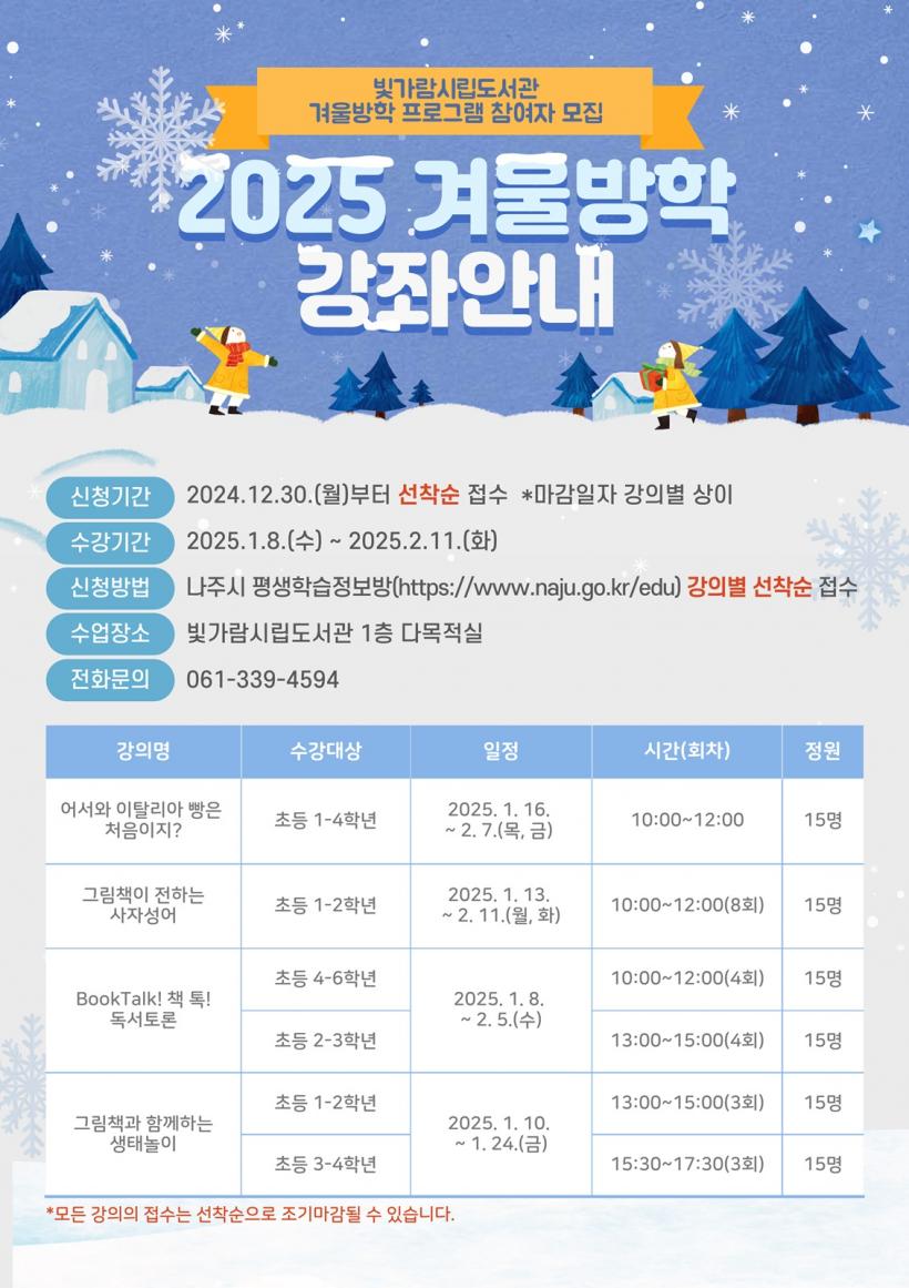 Àü¶ó³²µµ ³ªÁÖ½Ã(½ÃÀå À±º´ÅÂ)´Â 1¿ù 8ÀϺÎÅÍ 2¿ù 11ÀϱîÁö ¡®2025³â °Ü¿ï¹æÇÐ ÇÁ·Î±×·¥¡¯¿¡¼ 4°³ °Á¸¦ ¿î¿µÇÑ´Ù°í 6ÀÏ ¹àÇû´Ù.