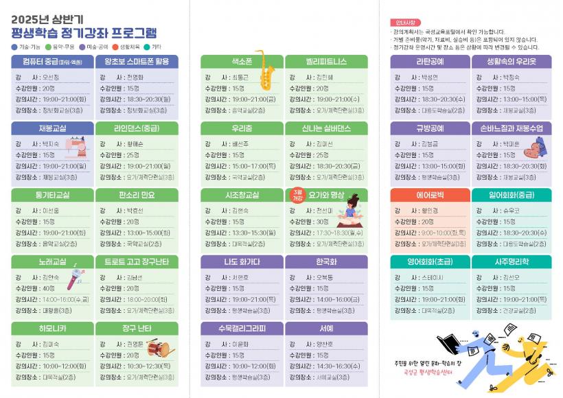 Æò»ýÇнÀ °Á´ ±â¼ú¡¤±â´É, À½¾Ç¡¤¹«¿ë, ¹Ì¼ú¡¤°ø¿¹, »ýȰüÀ°, ±âŸ(¿µ¾îÈ¸È µî) ÃÑ 5°³ ºÐ¾ß 18°¡ÁöÀÇ °Á·Π¿î¿µµÉ ¿¹Á¤ÀÌ´Ù.