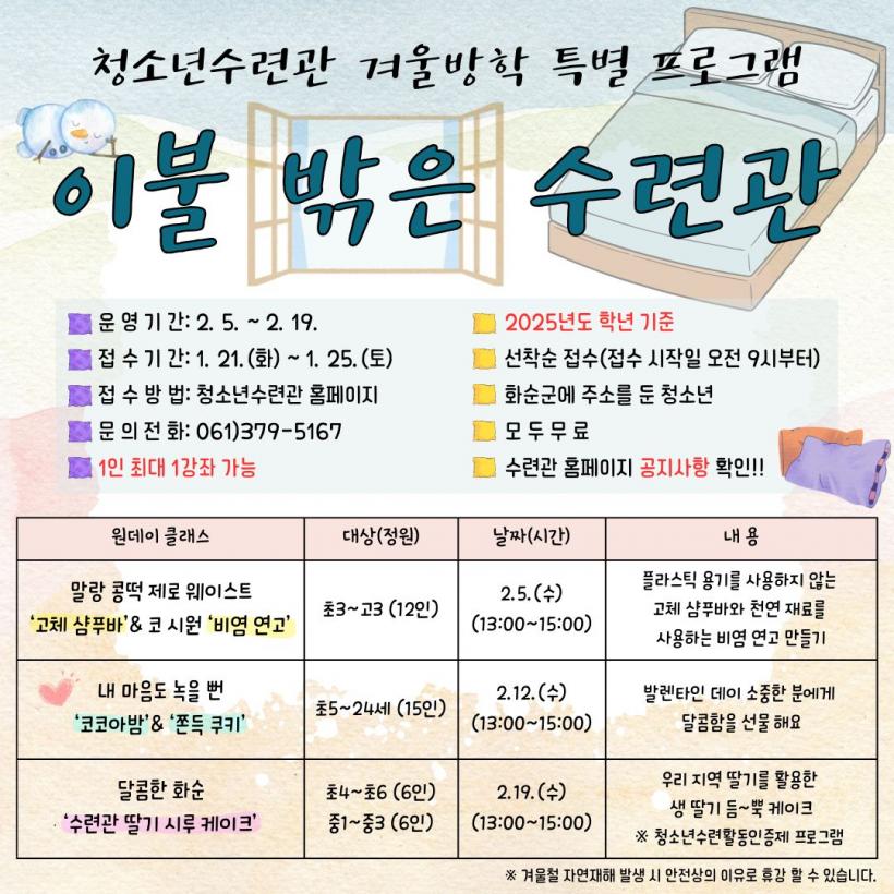 û¼Ò³â¼ö·Ã°üÀº ¸Å³â û¼Ò³âµéÀÇ ¾ËÂù ¹æÇÐ »ýȰÀ» À§ÇØ ´Ù¾çÇÑ ÇÁ·Î±×·¥À» ÁøÇàÇϰí ÀÖ´Ù. ¿ÃÇØµµ °Ü¿ï¹æÇÐ ¿øµ¥ÀÌ Å¬·¡½º·Î ¡ã¸»¶û Äá¶± Á¦·Î ¿þÀ̽ºÆ® ¡®°íü ¼¤Çª¹Ù¡¯& ÄÚ ½Ã¿ø¡®ºñ¿° ¿¬°í¡¯¡ã³» ¸¶À½µµ ³ìÀ» »· ¡®ÄÚÄھƹ㡯&¡®Â˵æ ÄíŰ¡¯¡ã´ÞÄÞÇÑ È¼ø ¡®¼ö·Ã°ü µþ±â ½Ã·ç ÄÉÀÌÅ©¡¯ ¸¸µé±â¸¦ ÁøÇàÇÒ ¿¹Á¤ÀÌ´Ù.