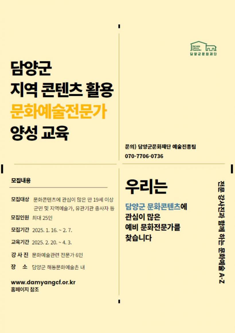 Àç´Ü ¹®È¿¹¼ú Àü¹®°¡ ¾ç¼º °úÁ¤Àº ´ã¾ç±º Áö¿ª ¹®È¸¦ ±â¹ÝÀ¸·Î ¹®È¿¹¼úÀü¹®°¡¸¦ À°¼ºÇϱâ À§ÇÑ ±³À°À¸·Î, 2¿ù 20ÀϺÎÅÍ 4¿ù 3ÀϱîÁö ÃÑ 7ȸÂ÷ °úÁ¤À» ¸ÅÁÖ ¸ñ¿äÀÏ(1¡¤2ȸÂ÷ ¸ñ¡¤±Ý¿äÀÏ) ¿ÀÈÄ 5½Ã¿¡ ÁøÇàÇÑ´Ù.