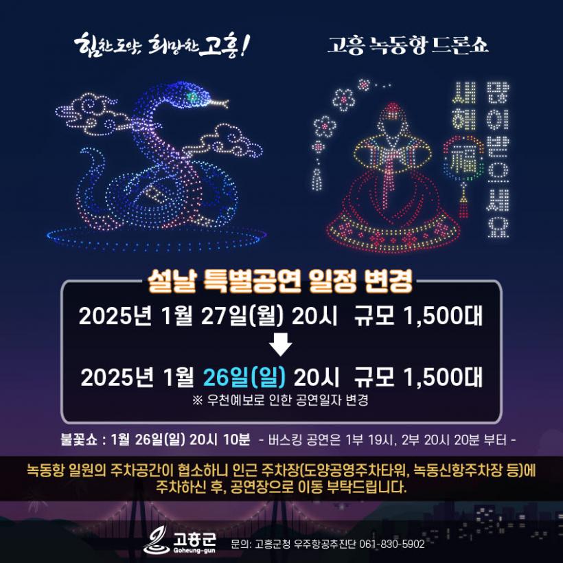 ±º °ü°èÀÚ´Â ¡°¿øÈ°ÇÑ Çà»ç ÁøÇà°ú ¾ÈÀüÇÑ °ø¿¬À» À§ÇØ ÀÏÁ¤À» º¯°æÇÑ °ÍÀÌ´Ï, °ü¶÷°´ ¿©·¯ºÐÀÇ ³ÐÀº ¾çÇØ¸¦ ºÎʵ台´Ù¡±¸ç, ¡°µå·Ð¼î ÀÏÁ¤ÀÌ º¯°æµÇ¸é ³ìµ¿Ç× µå·Ð¼î ȨÆäÀÌÁö(http://nokdongdrone.co.kr)³ª °íÈﱺ ´ëÇ¥ ´©¸®Áý(https://www.goheung.go.kr)¿¡ °øÁöÇÒ ¿¹Á¤ÀÌ´Ï, °ü¶÷ Àü ¹Ì¸® ÀÏÁ¤À» È®ÀÎÇØ ÁÖ½Ã±æ ¹Ù¶õ´Ù¡±°í ´çºÎÇß´Ù.