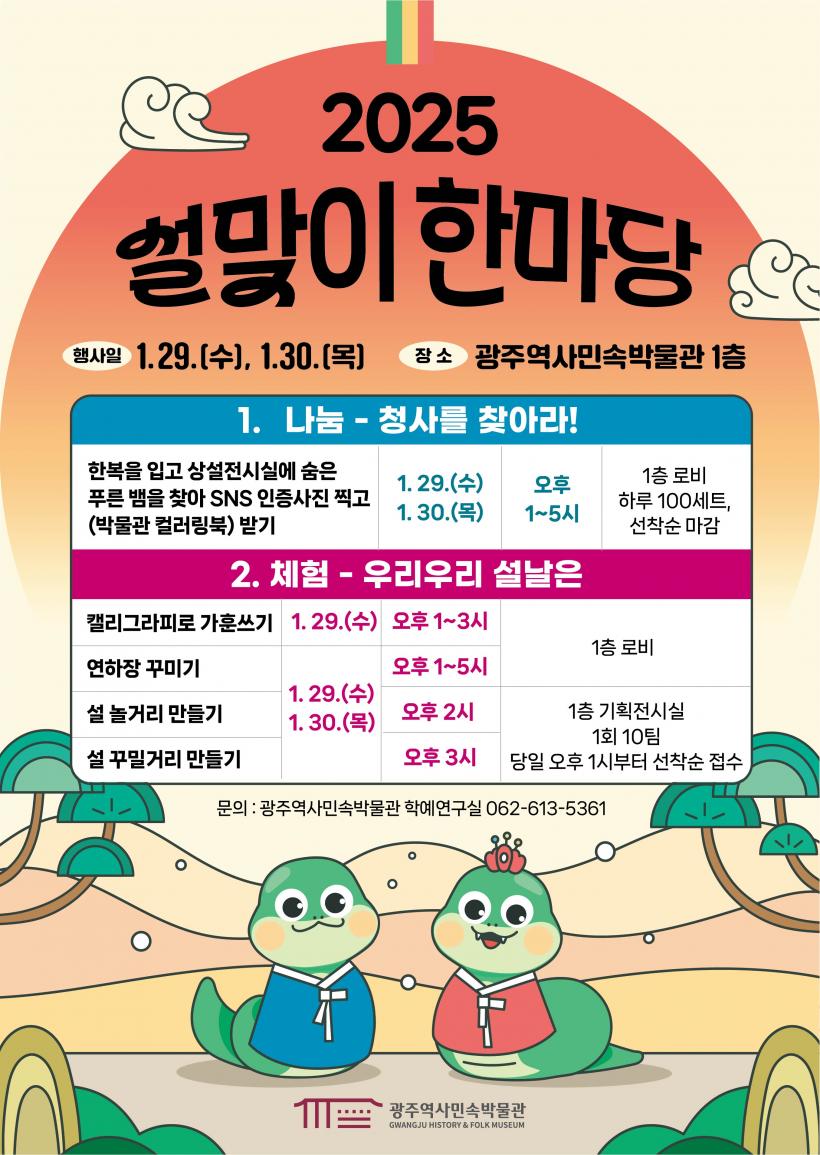¹Ú¹°°ü ·Îºñ¿Í ±âȹÀü½Ã½Ç¿¡¼´Â ´Ù¾çÇÑ Ã¼ÇèÇà»ç°¡ ÁغñµÅ ÀÖ´Ù. ¼³³¯ÀÎ 29ÀÏ ¿ÀÈÄ 1½ÃºÎÅÍ 3½Ã±îÁö ·Îºñ¿¡¼´Â °¡Á· °£ À¯´ë¸¦ ²ö²öÇÏ°Ô ´ÙÁö°Ô Çϴ Ķ¸®±×¶óÇÇ(¼Õ±Û¾¾)·Î °¡Èƾ²±â üÇèÀ» ÇÒ ¼ö ÀÖ´Ù. 29ÀϺÎÅÍ 30ÀÏ ÀÌÆ²°£ ¿ÀÈÄ 1½ÃºÎÅÍ 5½Ã±îÁö ·Îºñ¿¡¼´Â °¡Á·, Ä£±¸, ¿¬Àο¡°Ô ¼Õ¼ö ²Ù¹Î ¿¬ÇÏÀåÀ¸·Î »õÇØ Àλ縦 ÀüÇÒ ¼ö ÀÖ´Â ¡®¿¬ÇÏÀå ²Ù¹Ì±â¡¯ ÇÁ·Î±×·¥ÀÌ ÁøÇàµÈ´Ù.