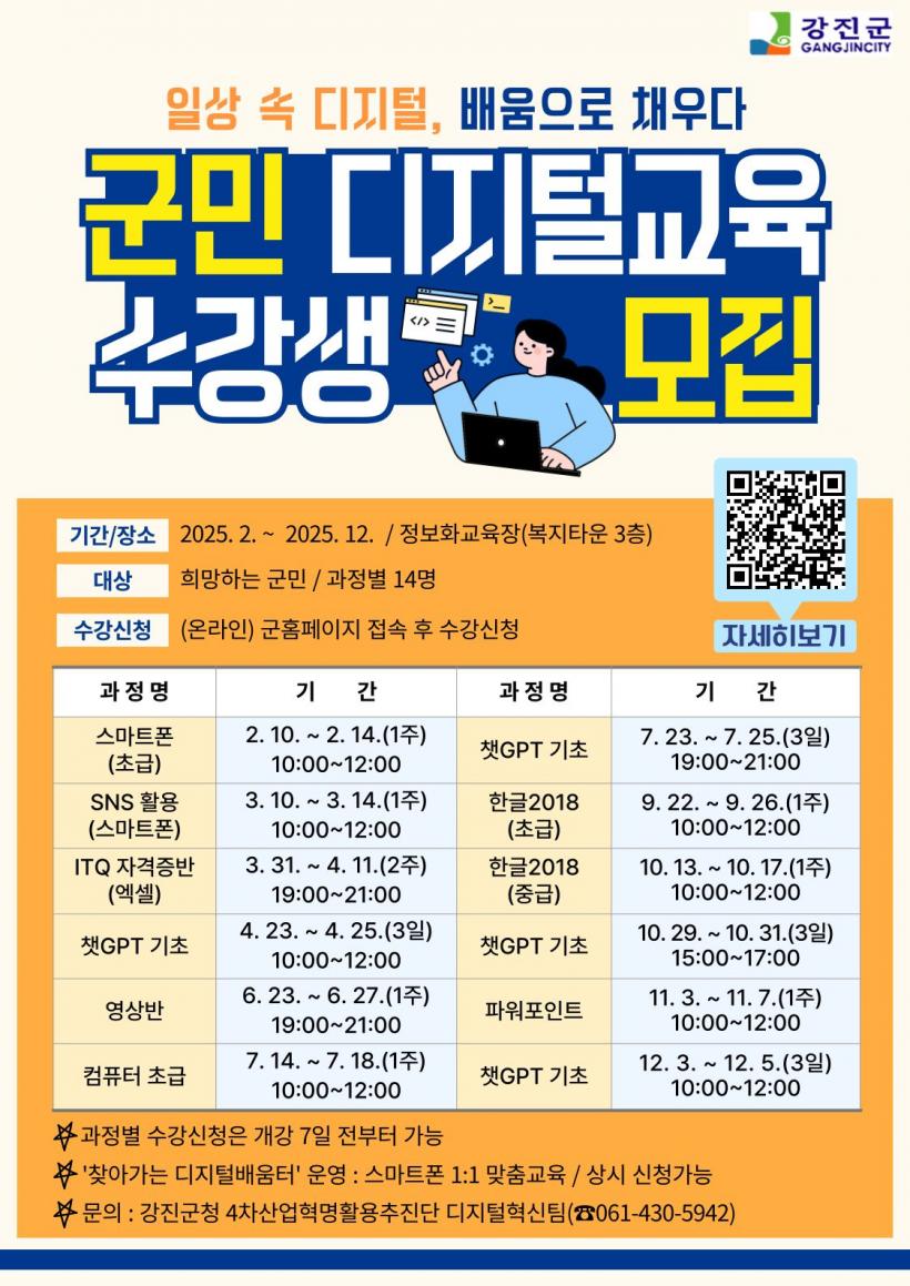 ±º¹Î µðÁöÅÐ ±³À°Àº ½º¸¶Æ®Æù ±âÃÊ, SNS Ȱ¿ë, ITQ ¿¢¼¿ ÀÚ°ÝÁõ¹Ý, êGPT Ȱ¿ë, ¿µ»ó ÆíÁý µî 12°³ÀÇ ±³À° °úÁ¤À¸·Î Æí¼ºÇØ 2¿ùºÎÅÍ 12¿ù±îÁö ÃßÁøÇϸç, ±º¹ÎÀº ´©±¸³ª ½Åû °¡´ÉÇÏ´Ù.