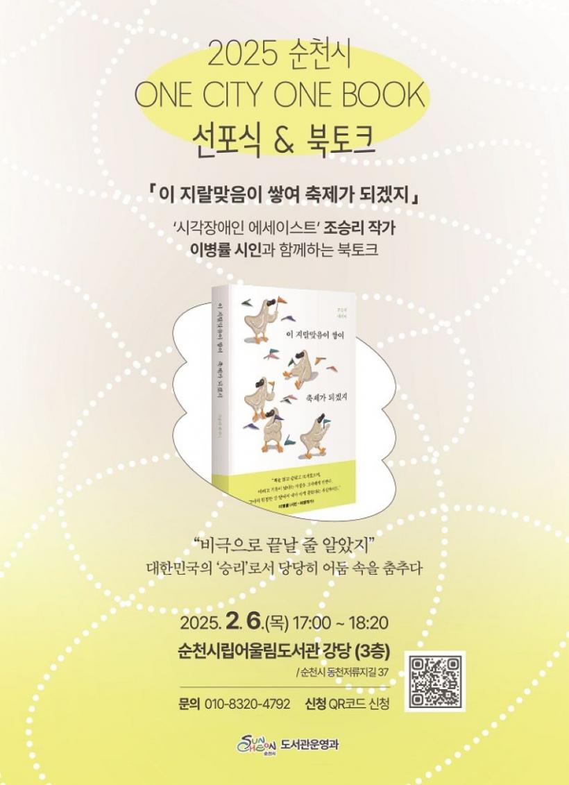 [°ø°£´º½º = ±è¿ëÁø±âÀÚ] ¼øÃµ½Ã(½ÃÀå ³ë°ü±Ô)´Â ¿À´Â 6ÀÏ 17½Ã ¾î¿ï¸²µµ¼°ü °´ç¿¡¼ 2025 ONE CITY ONE BOOK ¼±Æ÷½Ä°ú ºÏÅäÅ©¸¦ °³ÃÖÇÑ´Ù°í ¹àÇû´Ù. ¿ÃÇØ ¼øÃµ½Ã ¼±Á¤ µµ¼´Â Á¶½Â¸® ÀÛ°¡ÀÇ ¡®ÀÌ Áö¶ö¸ÂÀ½ÀÌ ½×¿© ÃàÁ¦°¡ µÇ°ÚÁö¡¯ ÀÌ´Ù.