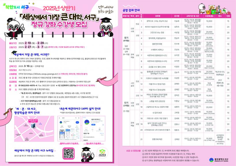 Àå±â °úÁ¤Àº ¡ãÀι®»çȸÇаú 4°³ °Á ¡ã¹®È¿¹¼úÇаú 4°³ °ÁÂ, ´Ü±â °úÁ¤Àº ¡ã½Ã¹ÎÂü¿©Çаú 5°³ ¡ãÀι®»çȸÇаú 2°³ °Á ¡ã¹®È¿¹¼úÇаú 5°³ °Á µî ÃÑ 3°³ Çаú 20°³ °Á·Π±¸¼ºµÅ ÀÖÀ¸¸ç, 3¿ù 10ÀϺÎÅÍ ¡¸¼¼․Å«․´ë ¼±¸¡¹Æò»ýÇнÀ°ü(°æ¿·Î 28, 4Ãþ~5Ãþ)°ú ¾î¸°ÀÌ»ýÅÂÇнÀµµ¼°ü¿¡¼ ÁøÇàµÈ´Ù.