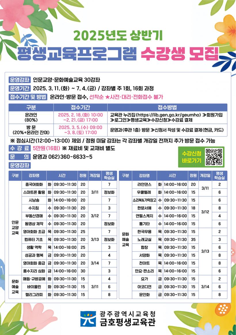 ¼ö° ½ÅûÀº ±ÝÈ£Æò»ý±³À°°ü ´©¸®Áý(https://lib.gen.go.kr/geumho)¿¡¼ ȸ¿ø°¡ÀÔÇÑ ÈÄ ¿Â¶óÀÎ Á¢¼öÇϰųª, ¿î¿µ°ú¿¡ ¹æ¹®ÇØ Á¢¼öÇÏ¸é µÈ´Ù. Á¢¼ö ±â°£Àº ¡¯Æò»ý±³À°ÇÁ·Î±×·¥¡®Àº ¿Â¶óÀÎ 2¿ù 18~21ÀÏ, ¹æ¹® 3¿ù 5~8ÀϱîÁöÀ̸ç, ¡¯¼ºÀι®Çر³½Ç¡®Àº ¿Â¶óÀÎ 2¿ù 25~28ÀÏ, ¹æ¹® 3¿ù 12~15ÀϱîÁöÀÌ´Ù.