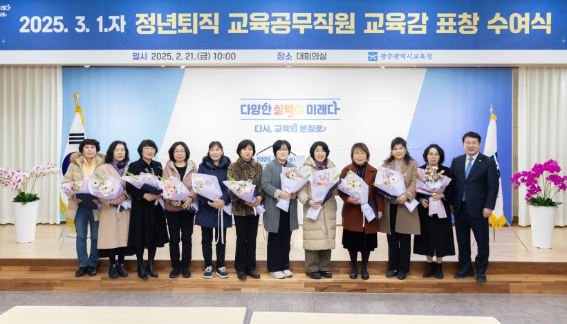 À̳¯ ¼ö¿©½Ä¿¡´Â ±³À°°ø¹«Á÷¿ø 11¸íÀÌ Âü¼®ÇÑ °¡¿îµ¥ ÀÌÁ¤¼± ±³À°°¨ÀÌ Âü¼®ÀÚ¿¡°Ô ǥâÀ» ¼ö¿©Çϰí, ±¤ÁÖ±³À°¹ßÀüÀ» À§ÇØ Çå½ÅÇÑ Á¤³âÅðÁ÷ ±³À°°ø¹«Á÷¿øÀÇ ³ë°í¸¦ Ä¡ÇÏÇß´Ù.