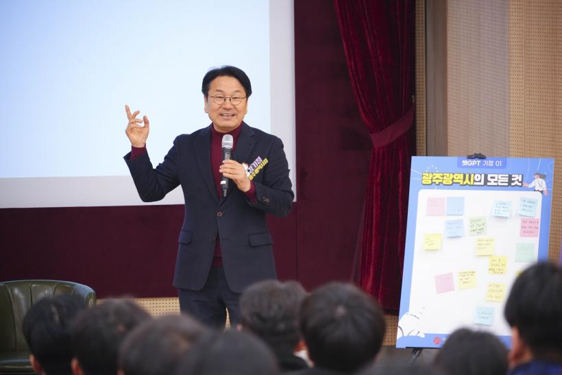 ° ½ÃÀåÀº »õ³»±â Á÷¿øµéÀÇ Áú¹®¿¡ ´äÇÏ¸ç ±¤ÁÖ ¹Ì·¡ ¸Ô°Å¸®¸¦ À§ÇÑ Àü·«Àû ¼±ÅÃÀÎ ÀΰøÁö´É(AI)°ú ¹Ì·¡Â÷ Á¤Ã¥¹æÇâ¿¡ ´ëÇØ ¼³¸íÇß´Ù. ° ½ÃÀåÀº ¡°±¤ÁÖ½Ã¿Í °ø°ø±â°üÀº ½Ã¹ÎÇູÀ̶ó´Â ¸ñÇ¥¸¦ ÇâÇØ ÇÔ²² °£´Ù. ¼·Î¿¡°Ô ÈûÀÌ µÇ´Â µçµçÇÑ ÆÄÆ®³ÊÀÌ´Ù¡±°í °Á¶Çß´Ù.