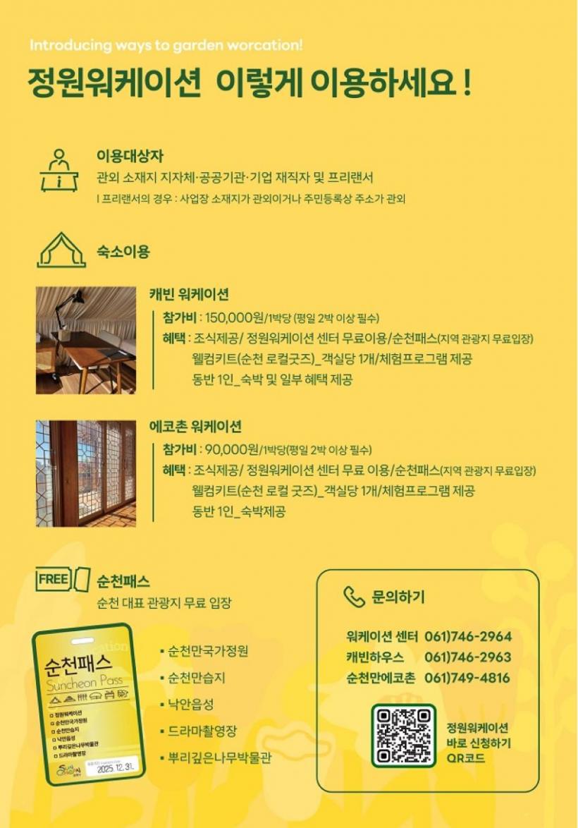 Á¦°øµÇ´Â ÇýÅÃÀÌ ±Ã±ÝÇÏ´Ù¸é ¼øÃµ½Ãû ´©¸®Áý(www.suncheon.go.kr/worcation) ¡®¿öÄÉÀÌ¼Ç ½Åû¡¯ ¸Þ´º¿¡¼ È®ÀÎÇÒ ¼ö ÀÖÀ¸¸ç, ¿¹¾àµµ ´©¸®ÁýÀ» ÅëÇØ ½ÅûÇÒ ¼ö ÀÖ´Ù.