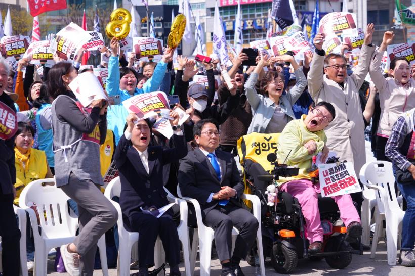 | °±âÁ¤ ±¤ÁÖ±¤¿ª½ÃÀåÀÌ 4ÀÏ 5¡¤18¹ÎÁÖ±¤Àå¿¡¼ Çå¹ýÀçÆÇ¼ÒÀÇ À±¼®¿ ´ëÅë·É ÆÄ¸é ¼±°í°¡ ³ª¿ÂµÚ ½Ã¹Îµé°ú ÇÔ²² ÀÓÀ» À§ÇÑ ÇàÁø°îÀ» Á¦Ã¢Çϰí ÀÖ´Ù. |