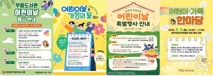 ±¤ÁÖ±¤¿ª½Ã¸³µµ¼°üÀº 5¿ù °¡Á¤ÀÇ ´Þ°ú ¾î¸°À̳¯À» ¸Â¾Æ 5¿ù ÇÑ ´Þ°£ Áö¿ª 3°³ µµ¼°ü(¹«µî‧»ê¼ö‧»çÁ÷)¿¡¼ ¾î¸°ÀÌ¿Í °¡Á·ÀÌ ÇÔ²² Áñ±æ ¼ö ÀÖ´Â ´Ùä·Î¿î ¹®È ÇÁ·Î±×·¥À» ¿î¿µÇÑ´Ù.