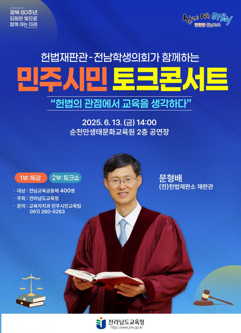 [°ø°£´º½º = ±è¼ö±Ù±âÀÚ] Àü¶ó³²µµ±³À°Ã»(±³À°°¨ ±è´ëÁß)Àº ¿À´Â 13ÀÏ ¿ÀÈÄ 2½Ã ¼øÃµ¸¸»ýŹ®È±³À°¿ø¿¡¼ ¹®Çü¹è Àü Çå¹ýÀçÆÇ¼Ò ÀçÆÇ°üÀ» ÃÊÃ»ÇØ, ¡®Çå¹ýÀçÆÇ°ü-Àü³²ÇлýÀÇȸ¿Í ÇÔ²²ÇÏ´Â ¹ÎÁֽùΠÅäÅ© ÄܼƮ¡¯¸¦ °³ÃÖÇÑ´Ù.