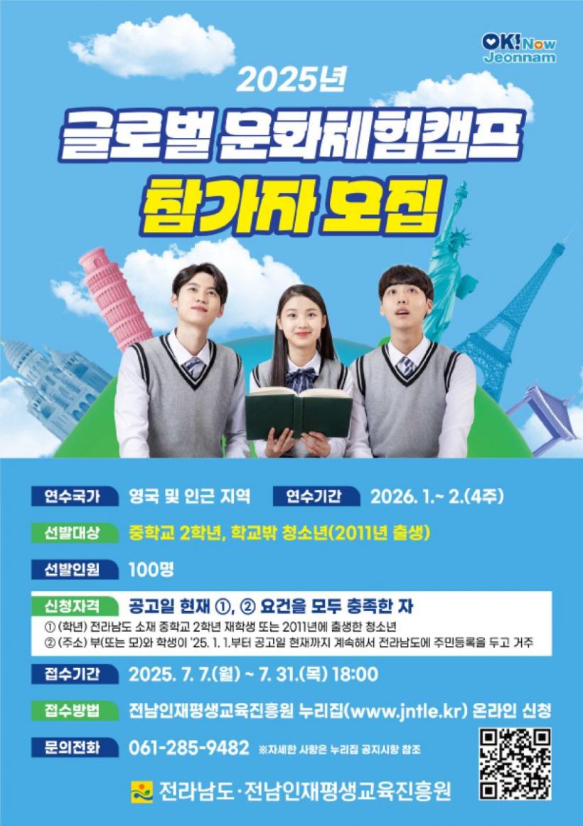 [°ø°£´º½º = ±è¼ö±Ù±âÀÚ] ȼø±º(±º¼ö ±¸º¹±Ô)Àº Àü³²ÀÎÀçÆò»ý±³À°ÁøÈï¿ø¿¡¼ Àü³² û¼Ò³âµéÀÇ ¼¼°è½Ã¹ÎÀÇ½Ä ÇÔ¾ç°ú ´Ù¹®È ¼ö¿ë¼º, ¿Ü±¹¾î Ȱ¿ë ´É·Â ÁõÁøÀ» À§ÇØ ¡®2025³â ±Û·Î¹ú ¹®ÈüÇè Ä·ÇÁ¡¯ Âü°¡ÀÚ¸¦ ¿À´Â 7¿ù 31ÀÏ(¸ñ)±îÁö °ø°³ ¸ðÁýÇÑ´Ù°í ¹àÇû´Ù.