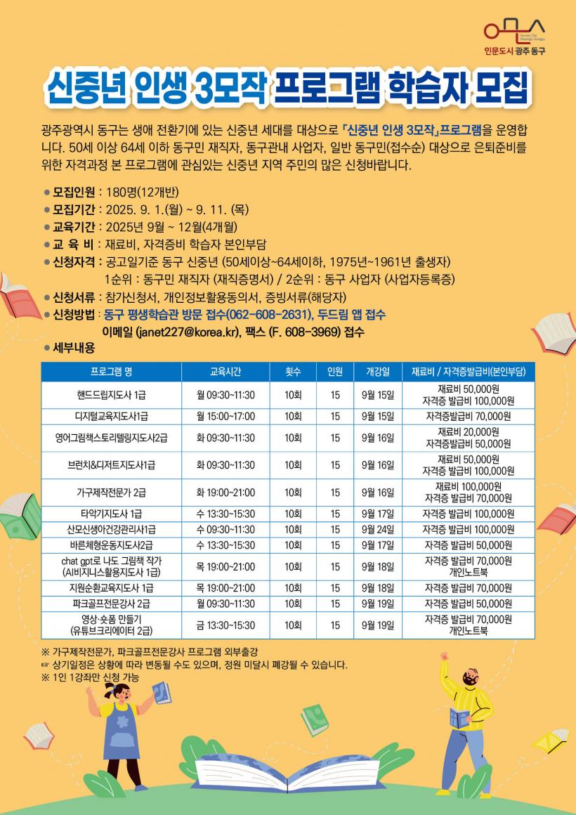 [°ø°£´º½º = ±è´ë¿µ±âÀÚ] ±¤ÁÖ µ¿±¸(±¸Ã»Àå ÀÓÅÃ)´Â »ý¾ÖÀüȯ±â¿¡ ÀÖ´Â ½ÅÁ߳⠼¼´ë(50¼¼ ÀÌ»ó~65¼¼ ÀÌÇÏ)¸¦ ´ë»óÀ¸·Î ³ë³â±âÀÇ À§±â¸¦ ´ëºñÇϱâ À§ÇØ ¡®½ÅÁß³â Àλý3¸ðÀÛ¡¯ Áö¿ø »ç¾÷ ¿î¿µ, 9¿ù 1ÀϺÎÅÍ ÇнÀÀÚ¸¦ ¸ðÁýÇÑ´Ù°í ¹àÇû´Ù.